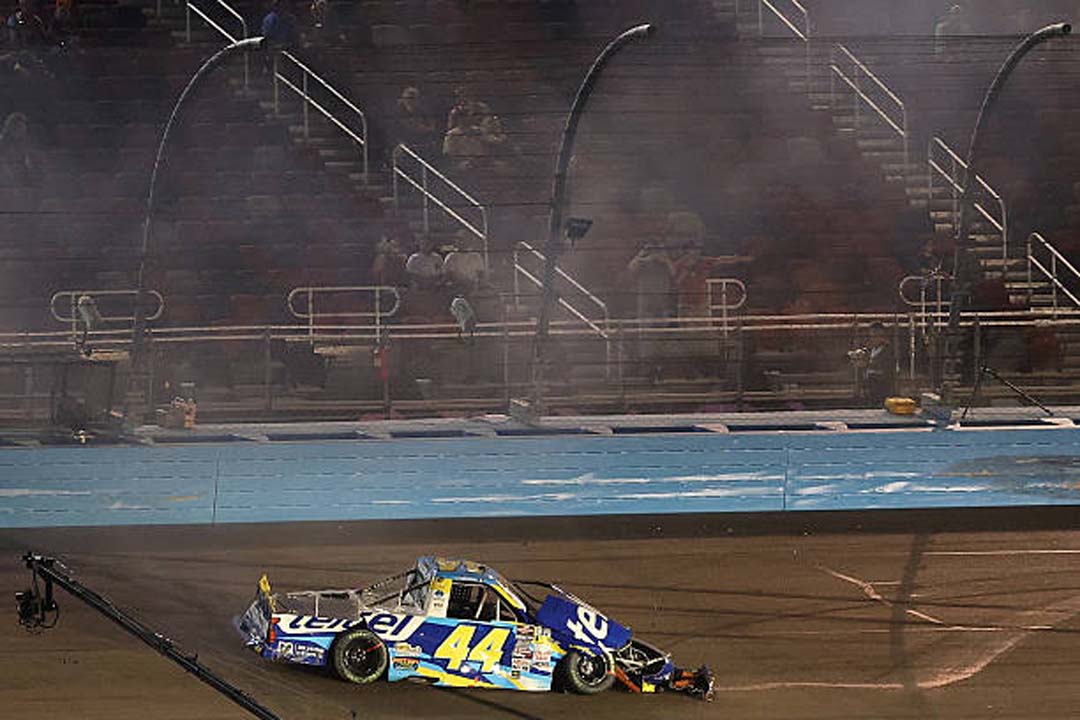 AVONDALE, ARIZONA – OCTOBER 31: Andres Perez De Lara, driver of the #44 Telcel Chevrolet, spins after an on-track incident during the NASCAR Craftsman Truck Series Championship at Phoenix Raceway on October 31, 2025 in Avondale, Arizona. (Photo by Christian Petersen/Getty Images)