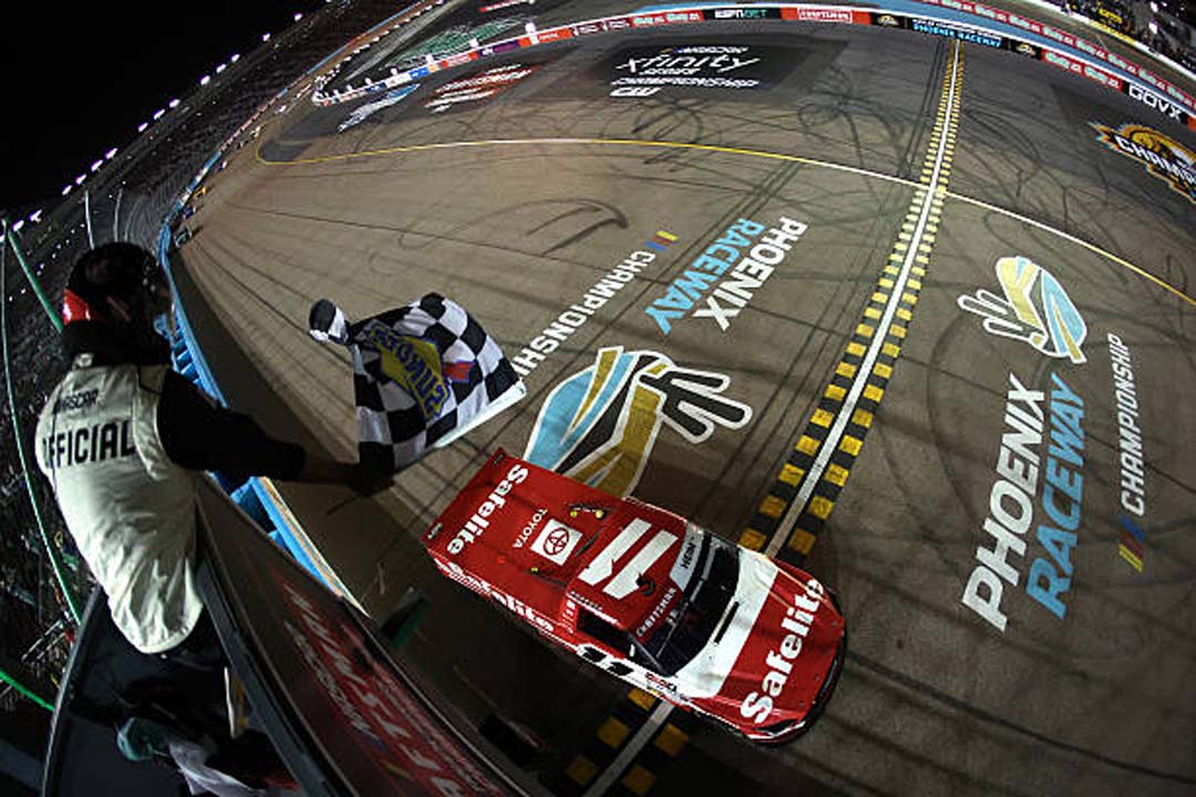 AVONDALE, ARIZONA – OCTOBER 31: Corey Heim, driver of the #11 Safelite Toyota, takes the checkered flag to win the NASCAR Craftsman Truck Series Championship at Phoenix Raceway on October 31, 2025 in Avondale, Arizona. (Photo by Meg Oliphant/Getty Images)