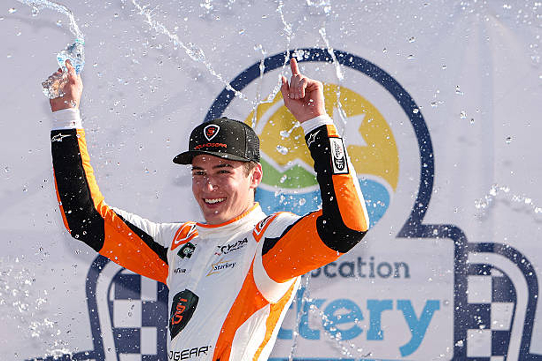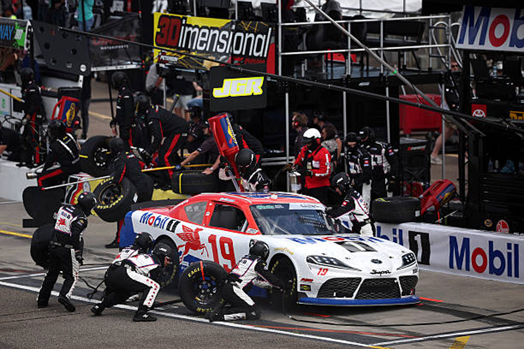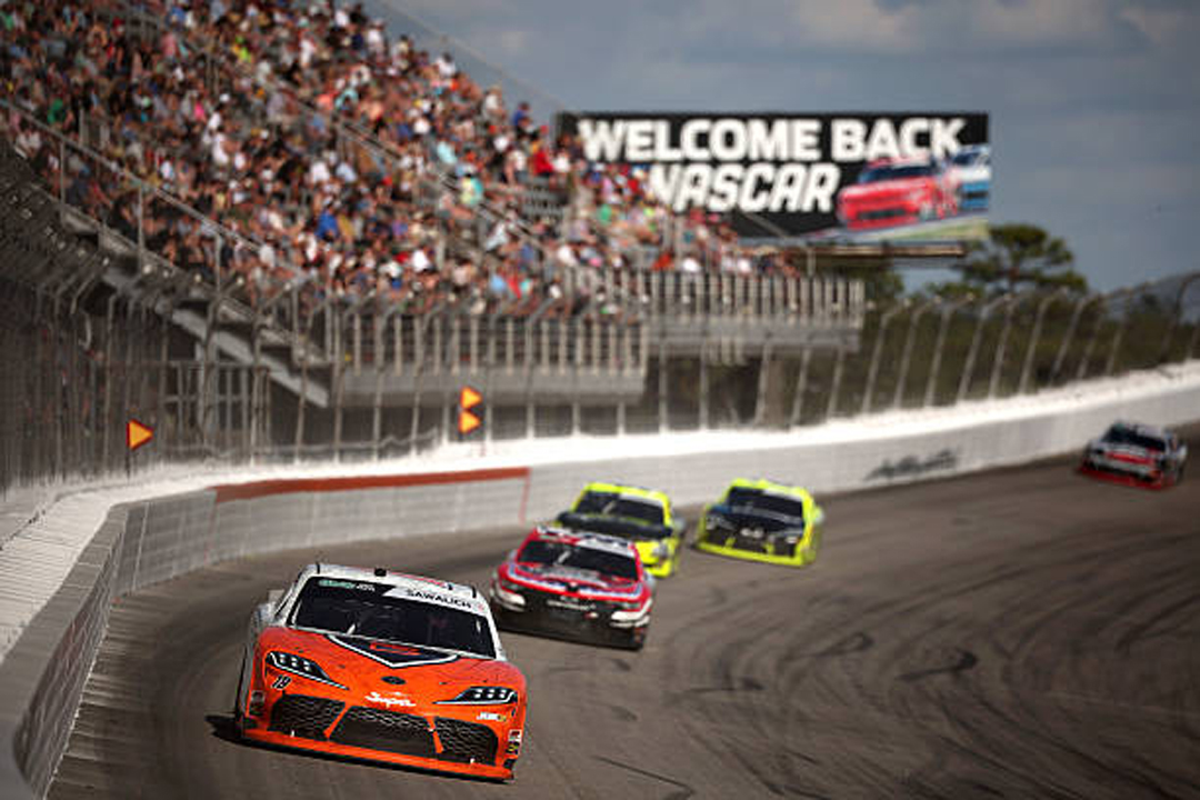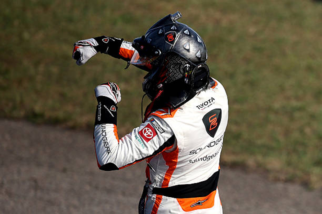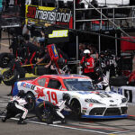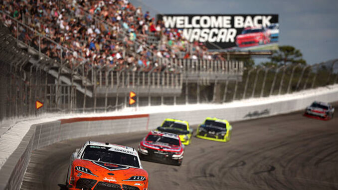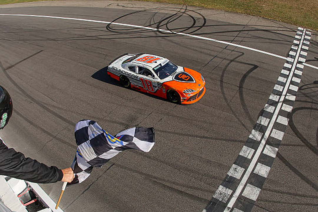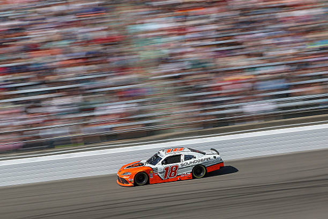 ROCKINGHAM, NORTH CAROLINA - APRIL 04: William Sawalich, driver of the #18 Soundgear Toyota, leads the field during the NASCAR O'Reilly Auto Parts Series North Carolina Education Lottery 250 Presented by Black's Tire at Rockingham Speedway on April 04, 2026 in Rockingham, North Carolina. (Photo by James Gilbert/Getty Images)