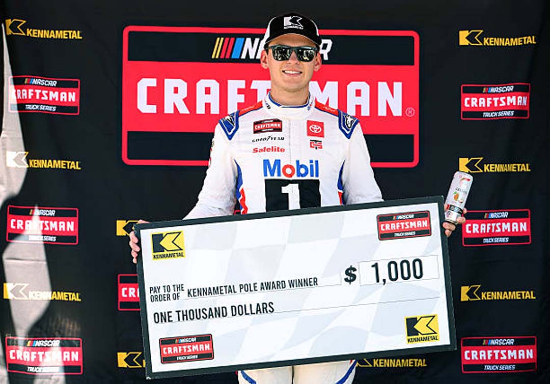 CONCORD, NORTH CAROLINA – OCTOBER 03: Corey Heim, driver of the #11 Mobil 1 Toyota, poses with the pole award winner $1,00.00 check during qualifying for the NASCAR Craftsman Truck Series EcoSave 250 at Charlotte Motor Speedway on October 03, 2025 in Concord, North Carolina. (Photo by David Jensen/Getty Images)