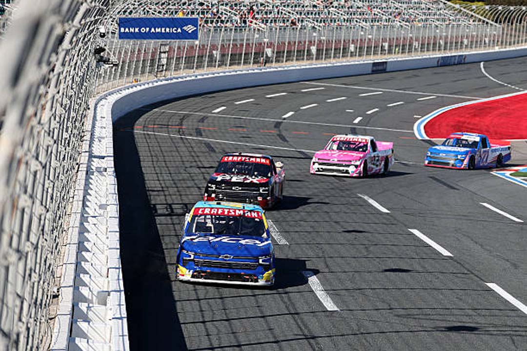 CONCORD, NORTH CAROLINA – OCTOBER 03: Andres Perez De Lara, driver of the #44 Telcel Chevrolet, Connor Mosack, driver of the #81 Apollo PEX Chevrolet, and Matt Mills, driver of the #42 Utilitra Chevrolet, race during the NASCAR Craftsman Truck Series EcoSave 250 at Charlotte Motor Speedway on October 03, 2025 in Concord, North Carolina. (Photo by David Jensen/Getty Images)