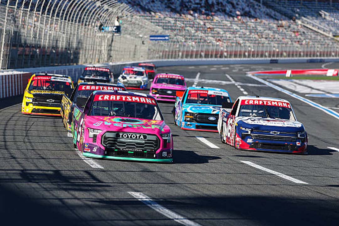CONCORD, NORTH CAROLINA – OCTOBER 03: Toni Breidinger, driver of the #5 Overplay Toyota, and Kris Wright, driver of the #16 F.N.B. Corporation Chevrolet, race during the NASCAR Craftsman Truck Series EcoSave 250 at Charlotte Motor Speedway on October 03, 2025 in Concord, North Carolina. (Photo by David Jensen/Getty Images)