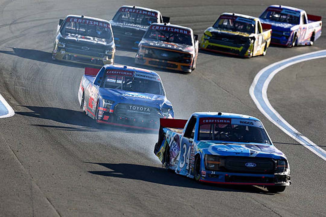 CONCORD, NORTH CAROLINA – OCTOBER 03: Layne Riggs, driver of the #34 Clew Ford, and Kaden Honeycutt, driver of the #52 Halmar International Toyota, race during the NASCAR Craftsman Truck Series EcoSave 250 at Charlotte Motor Speedway on October 03, 2025 in Concord, North Carolina. (Photo by David Jensen/Getty Images)