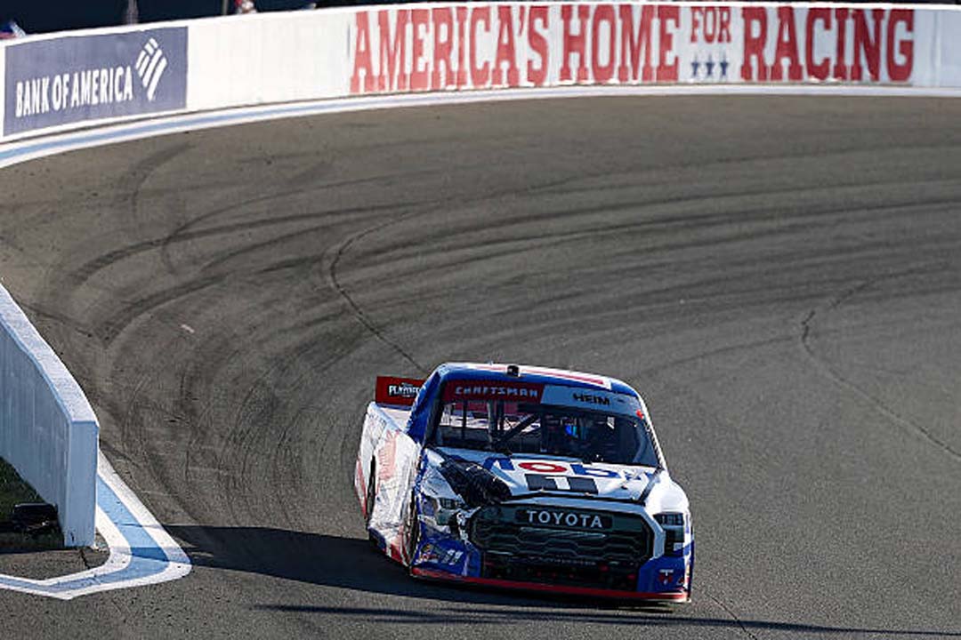 CONCORD, NORTH CAROLINA – OCTOBER 03: Corey Heim, driver of the #11 Mobil 1 Toyota, drives a damaged truck during the NASCAR Craftsman Truck Series EcoSave 250 at Charlotte Motor Speedway on October 03, 2025 in Concord, North Carolina. (Photo by David Jensen/Getty Images)