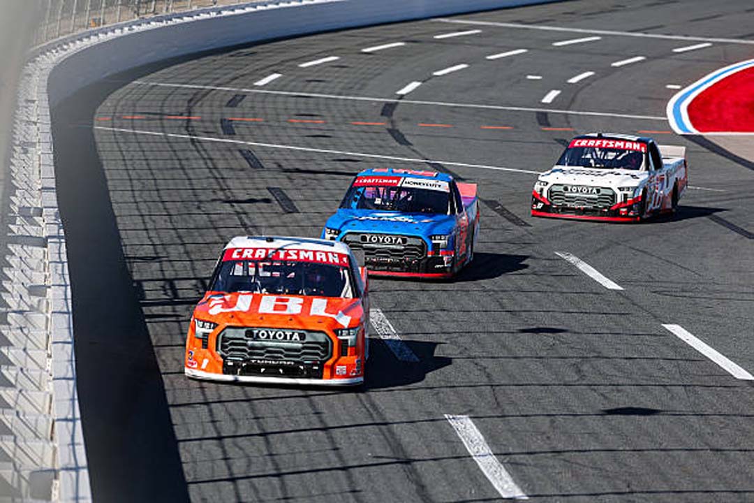 CONCORD, NORTH CAROLINA – OCTOBER 03: Brent Crews, driver of the #1 JBL Toyota, Kaden Honeycutt, driver of the #52 Halmar International Toyota, and Giovanni Ruggiero, driver of the #17 First Auto Group Toyota, race during the NASCAR Craftsman Truck Series EcoSave 250 at Charlotte Motor Speedway on October 03, 2025 in Concord, North Carolina. (Photo by David Jensen/Getty Images)