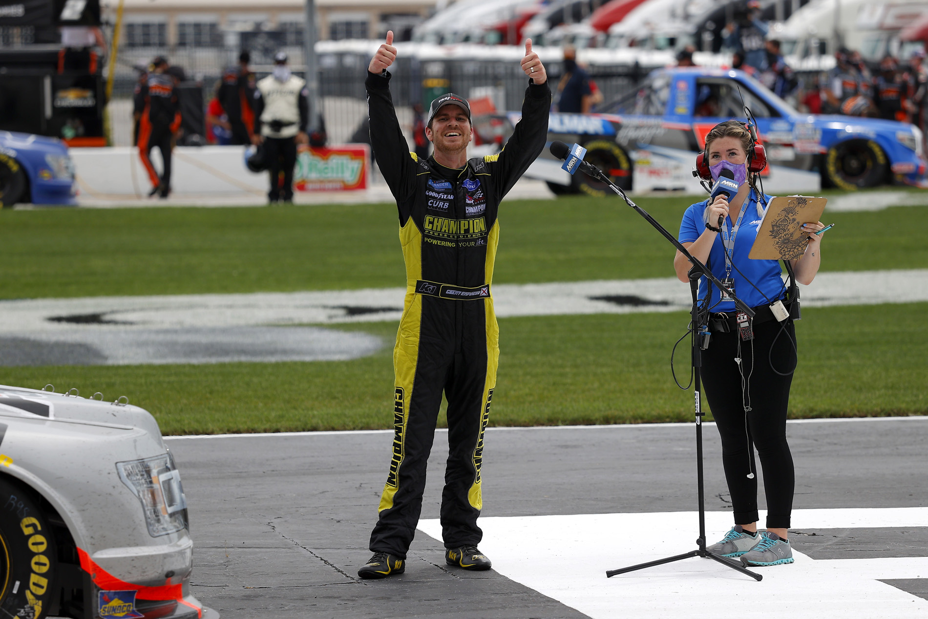 HAMPTON, GEORGIA – JUNE 06: Grant Enfinger, driver of the #98 Farm Paint Ford, celebrates after winning the NASCAR Gander Outdoors Truck Series Vet Tix Camping World 200 at Atlanta Motor Speedway on June 06, 2020 in Hampton, Georgia. (Photo by Kevin C. Cox/Getty Images)