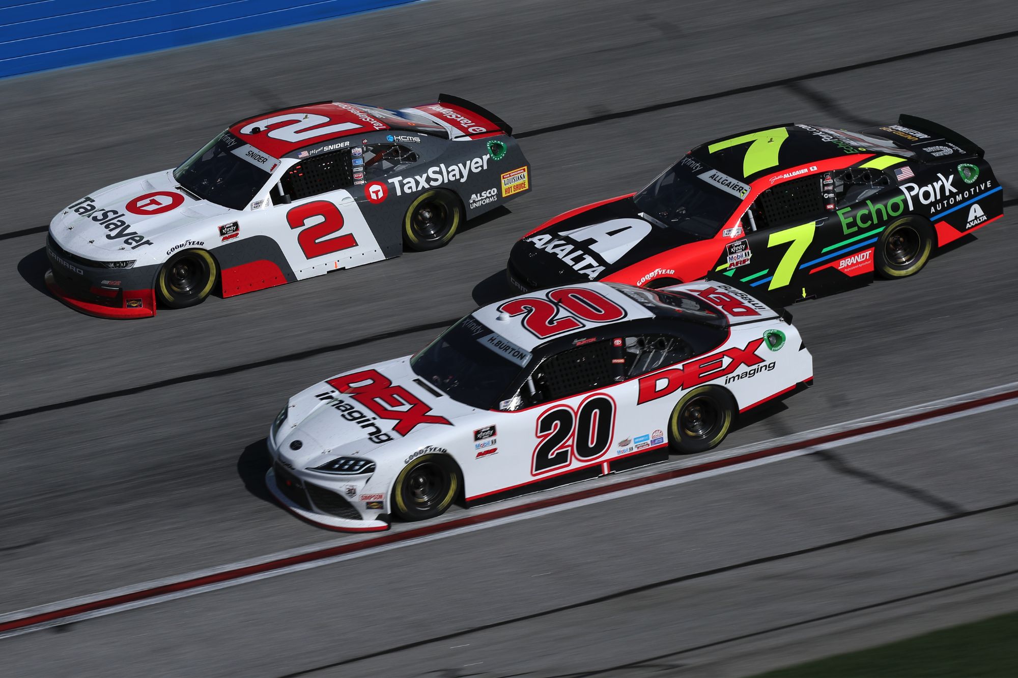 HAMPTON, GEORGIA – MARCH 20: Myatt Snider, driver of the #2 TaxSlayer Chevrolet, Justin Allgaier, driver of the #7 Axalta/EchoPark Automotive Chevrolet, and Harrison Burton, driver of the #20 DEX Imaging Toyota, race during the NASCAR Xfinity Series EchoPark 250 at Atlanta Motor Speedway on March 20, 2021 in Hampton, Georgia. (Photo by Sean Gardner/Getty Images)