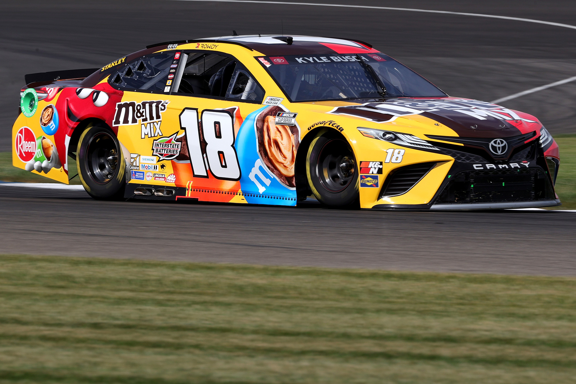 INDIANAPOLIS, INDIANA – AUGUST 14: Kyle Busch, driver of the #18 M&M’s Mix Toyota, drives during practice for the NASCAR Cup Series Verizon 200 at the Brickyard at Indianapolis Motor Speedway on August 14, 2021 in Indianapolis, Indiana. (Photo by Stacy Revere/Getty Images)