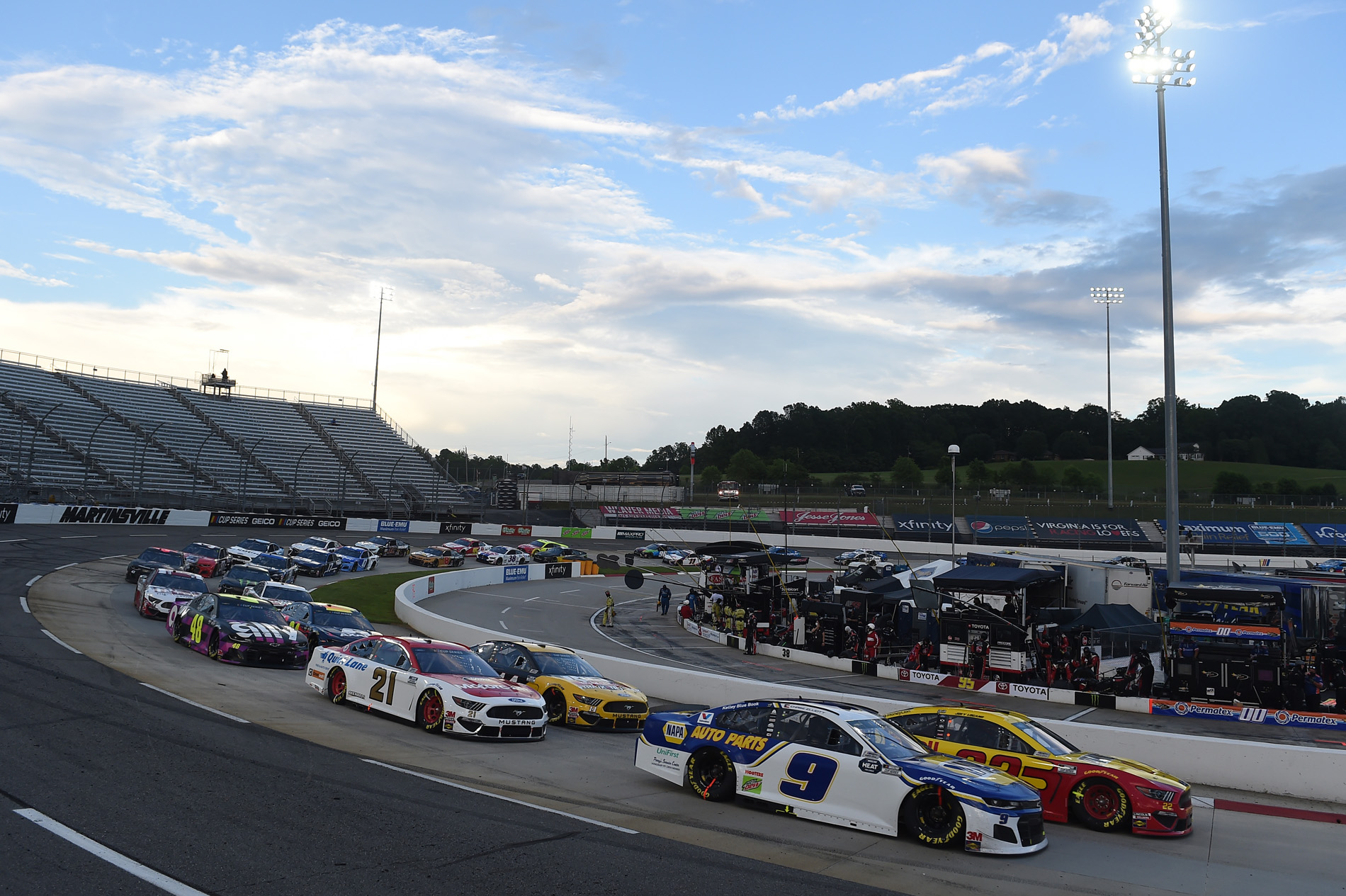 MARTINSVILLE, VIRGINIA – JUNE 10: Chase Elliott, driver of the #9 NAPA Auto Parts Chevrolet, and Joey Logano, driver of the #22 Shell Pennzoil Ford, lead the field during the NASCAR Cup Series Blue-Emu Maximum Pain Relief 500 at Martinsville Speedway on June 10, 2020 in Martinsville, Virginia. (Photo by Jared C. Tilton/Getty Images)