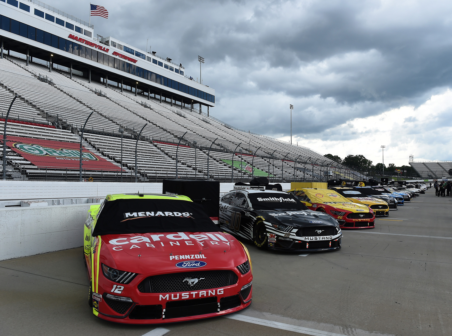MARTINSVILLE, VIRGINIA – JUNE 10: The #12 Menards/Cardell Caninetry Ford, driven by Ryan Blaney, and the #10 Smithfield Ford, driven by Aric Almirola, sit on the grid prior to the NASCAR Cup Series Blue-Emu Maximum Pain Relief 500 at Martinsville Speedway on June 10, 2020 in Martinsville, Virginia. (Photo by Jared C. Tilton/Getty Images)
