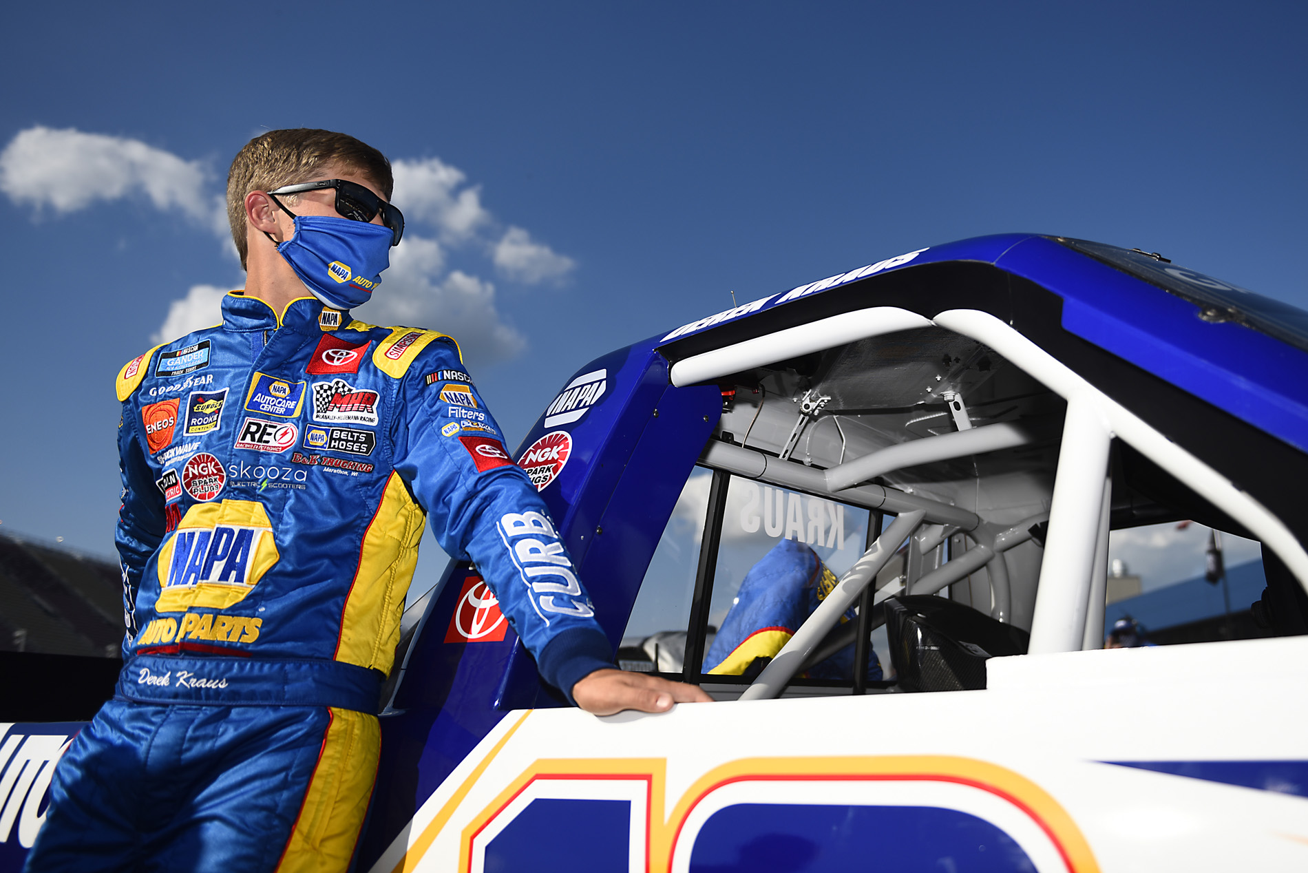 BROOKLYN, MICHIGAN – AUGUST 07: Derek Kraus, driver of the #19 NAPA Autocare Toyota, waits on the grid prior to the NASCAR Gander RV & Outdoors Truck Series Henry Ford Health System 200 at Michigan International Speedway on August 07, 2020 in Brooklyn, Michigan. (Photo by Jared C. Tilton/Getty Images)