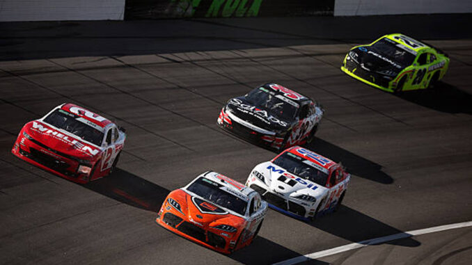 ROCKINGHAM, NORTH CAROLINA - APRIL 04: William Sawalich, driver of the #18 Soundgear Toyota, Jesse Love, driver of the #2 Whelen Chevrolet, Brent Crews, driver of the #19 Mobil 1 Toyota, Ryan Sieg, driver of the #39 SciAps/SA Recycling Chevrolet, and Brandon Jones, driver of the #20 Menards/Pelonis Toyota, race during the NASCAR O'Reilly Auto Parts Series North Carolina Education Lottery 250 Presented by Black's Tire at Rockingham Speedway on April 04, 2026 in Rockingham, North Carolina. (Photo by James Gilbert/Getty Images)